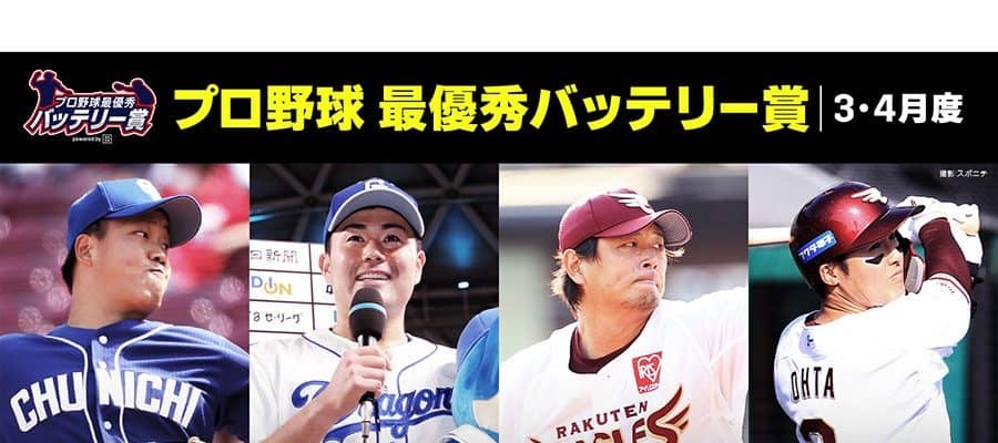 「2021プロ野球月間最優秀バッテリー賞 powered by DAZN」の3、4月度が17日、発表され、セ・リーグは中日の柳裕也投手-木下拓哉捕手、パ・リーグは楽天の涌井秀章投手-太田光捕手が選出された。