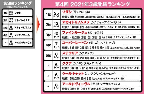 3位は、桜花賞3着のファインルージュ。その結果を受けて、圏外から一気にランクインを果たした。