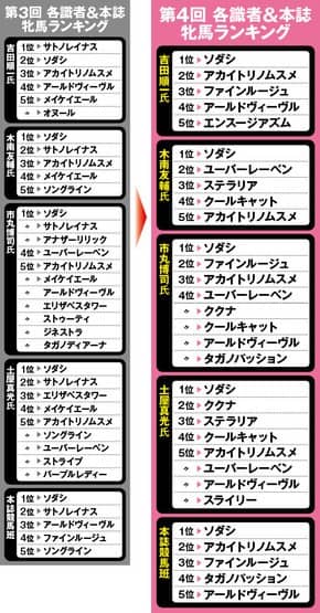 ※『Sportivaオリジナル番付』とは、デイリー馬三郎の吉田順一記者、日刊スポーツの木南友輔記者、独特なデータを駆使するパソコン競馬ライターの市丸博司氏、フリーライターの土屋真光氏、Sportiva編集部競馬班の5者それぞれが、今回はオークスに出走予定の3歳牝馬の実力・能力を分析しランク付け。さらに、そのランキングの1位を5点、2位を4点、3位を3点、4位を2点、5位を1点として、総合ポイントを集計したもの。