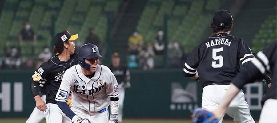 三遊間に挟まれる西武・源田壮亮(中央)【写真:荒川祐史】
