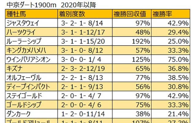 ハーツクライ産駒は[3-1-1-12]。直近1年で最多タイとなる3勝を挙げており、本競走と同様に中京ダート1900mで代替開催された21年アルデバランS(オープン)をロードレガリスが制している。また、すべて別馬によって3勝を挙げていることにも種牡馬としての価値を見出せそうだ。同産駒からは、スワーヴアラミスが出走予定。