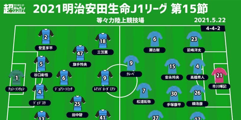 【明治安田生命J1リーグ第15節】 2021年5月22日(土) 15:00キックオフ 川崎フロンターレ(1位/45pt)…