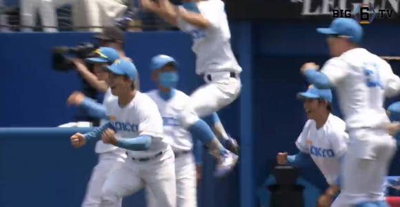 その井澤はテンポの良い投球で法大打線を封じ三者凡退で試合終了。