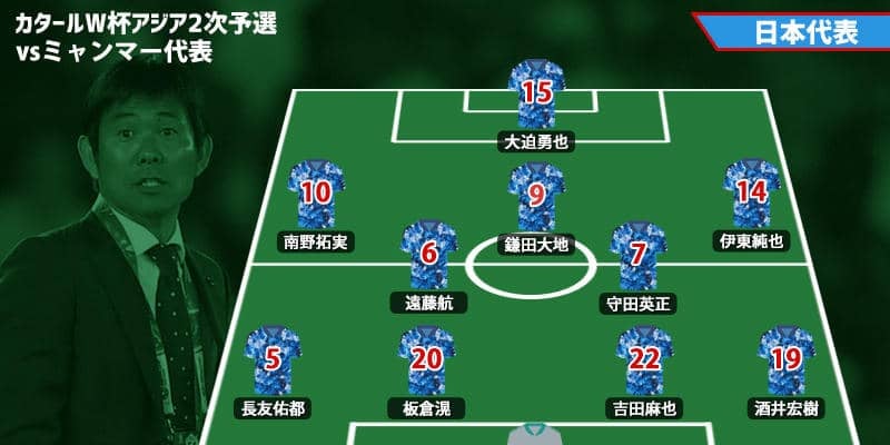 オール海外組で臨むミャンマー戦では、GKに川島永嗣(ストラスブール)が入り今予選初出場。6月の試合に向けて合流するGK権田修一(清水エスパルス)が5試合を守り続けていた中、初めて違うGKがゴールを守ることとなった。