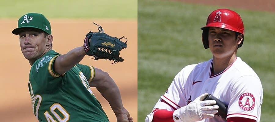 完封したアスレチックスのバシット(左)とエンゼルス・大谷翔平【写真:AP】