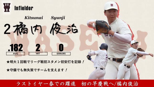 ◆橘内俊治(きつない・しゅんじ) 1999(平11)年8月13日生まれ。179センチ。85キロ。東京・早実高出身。教育学部4年。内野手。右投右打。自分に付けたい野球ゲームの特殊能力という問いに「アベレージヒッター」と答えてくれた橘内選手。早慶戦では、勝負が懸かる場面での一打に期待しましょう!
