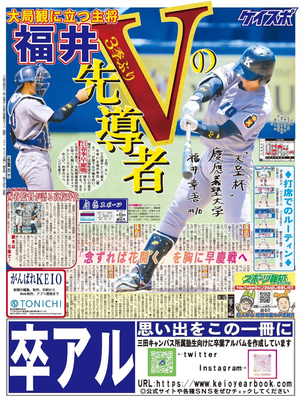 1面では慶大を3季ぶりの優勝に導いた福井主将を特集しています。守備良し、打撃良しの福井選手。しかし一番の強みは、野球を○○する力だとか…。打席での独特なルーティンの解説や、大阪桐蔭高校・西谷浩一監督が語る高校時代の福井選手についての記事も必読です!