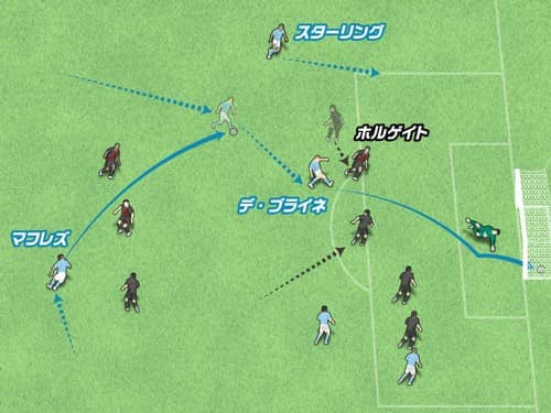 マフレズはワンツーから中へ進入。逆サイドのデ・ブライネはどこへ動いたか