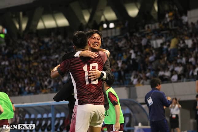 早慶サッカー定期戦で決勝ゴールを決めた加藤拓己と抱き合う外池監督
