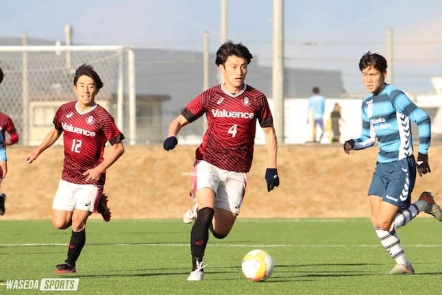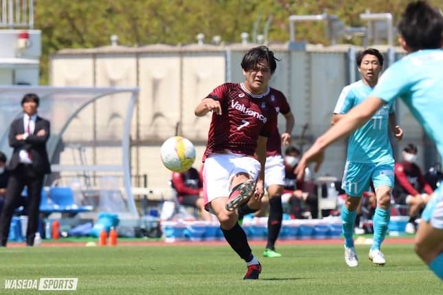 左足のキック精度が武器の山下。小倉とのドイスボランチは早大の要だ