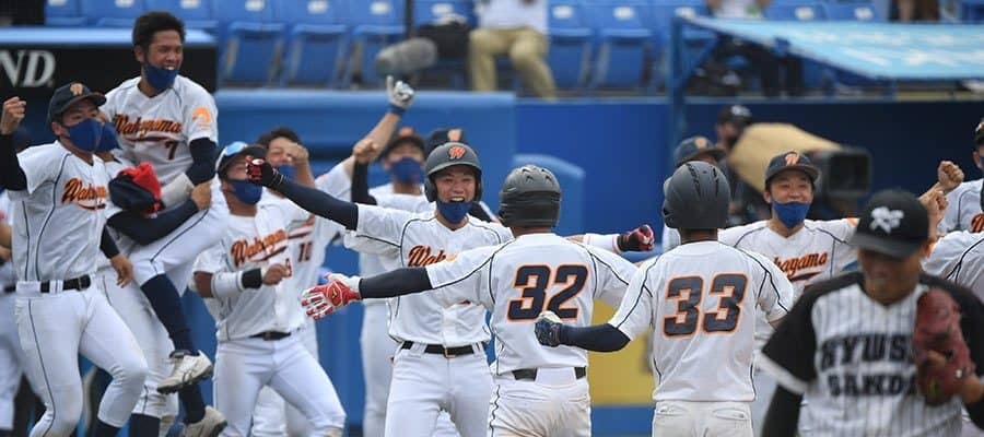 1点を追う10回裏。和歌山大は1死一、二塁で6番・久保田泰司内野手(4年)の打席で重盗に成功。久保田が四球で歩き、満塁とすると、4回に本塁打を放っている柏田樹外野手(4年)が二塁への強襲安打。二塁手がボールを弾く間に、2人の走者が生還した。