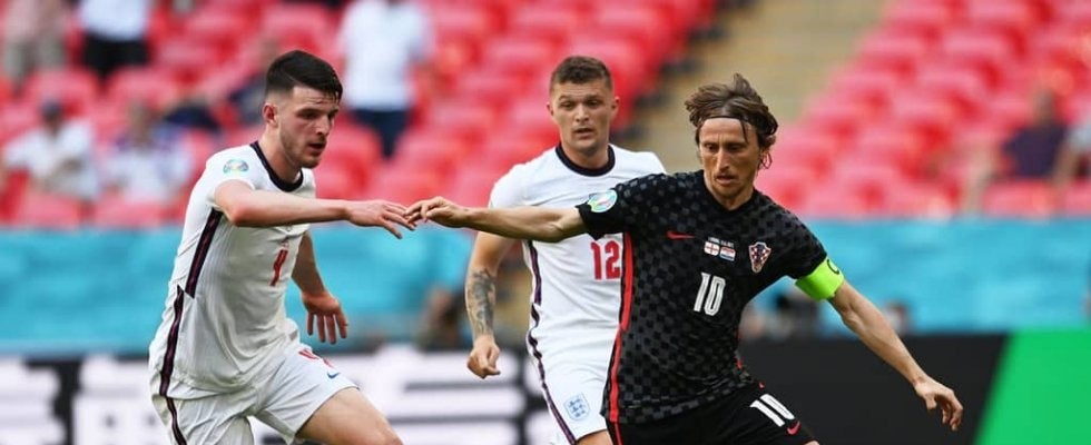 そのまま左サイドを攻め込まれ、ボールは一気に上がってきたトリッピアーへ。そこからペナルティエリア手前中央で待ち構えていたハリー・ケインにマイナスのボールが出されると、届く寸前のところでなんとかカットしたのがモドリッチだった。