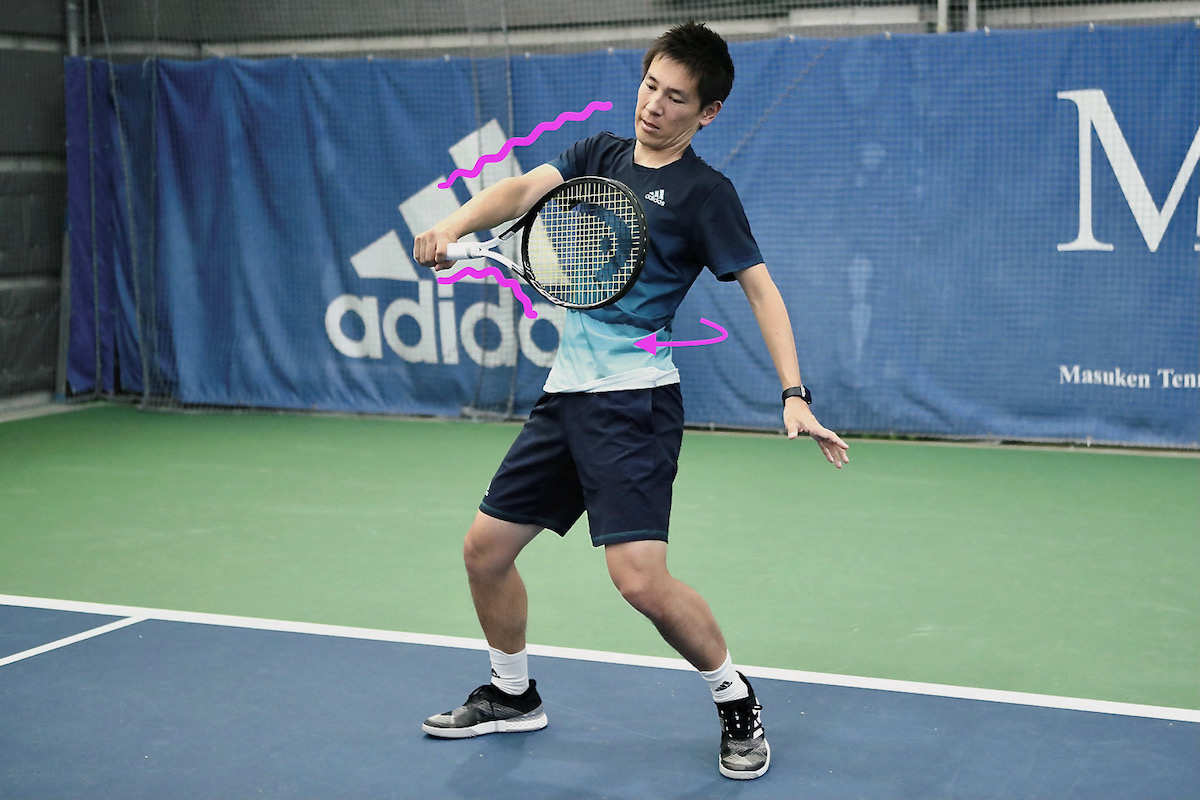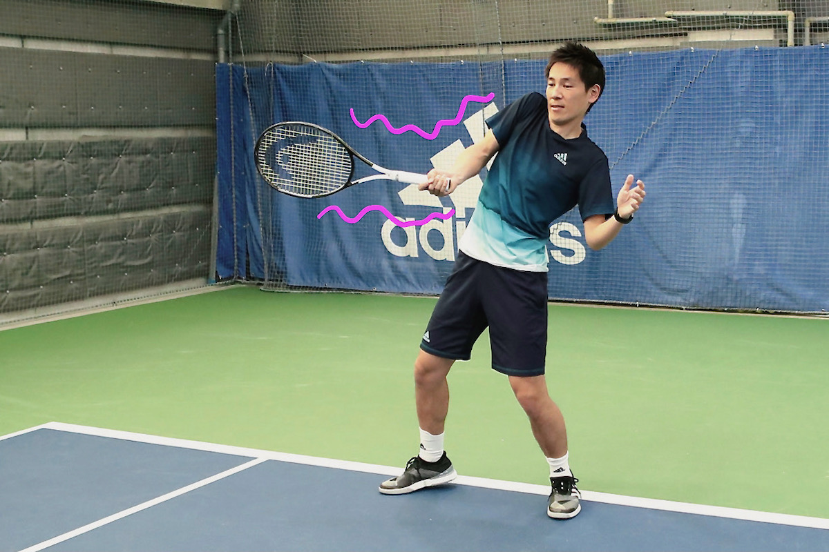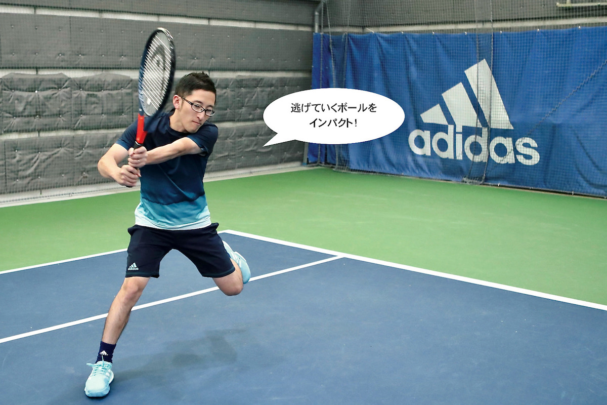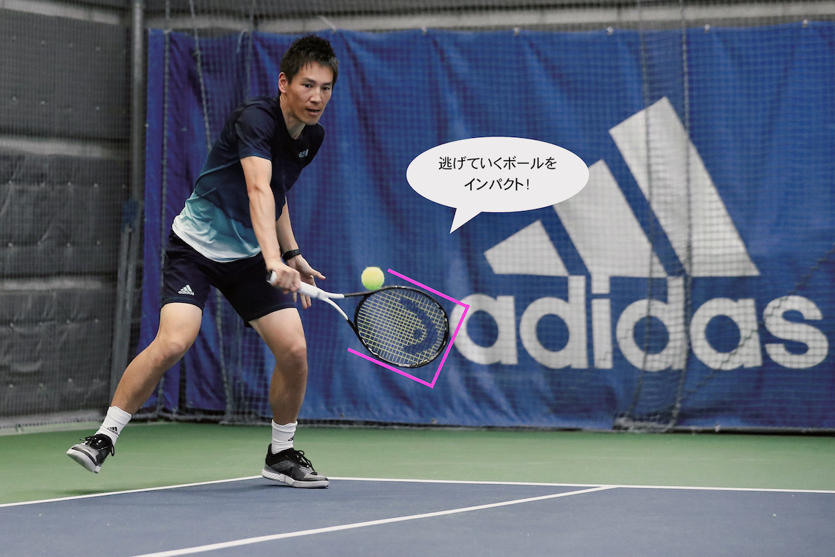 気をつけたいのは、スタンスを問わず『しっかり肩を入れる&体を開かずにスイングする』こと。特に片手バックでは、右肩を支点にスイングするので、開いて動いてしまうと余計に間に合わなくなります。