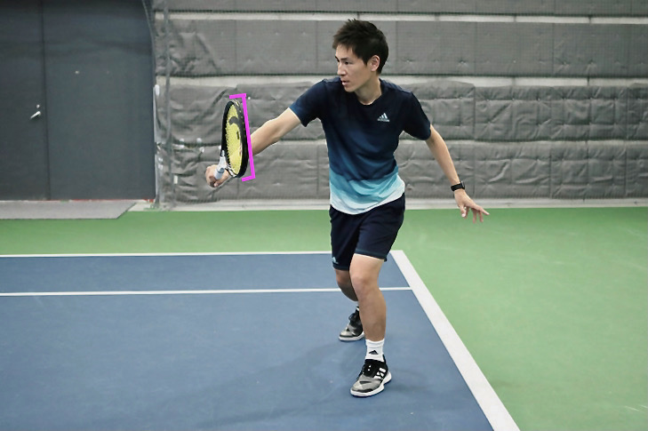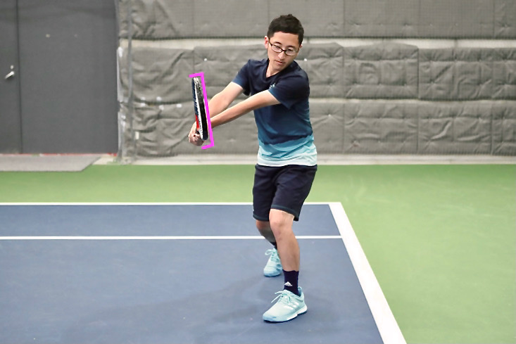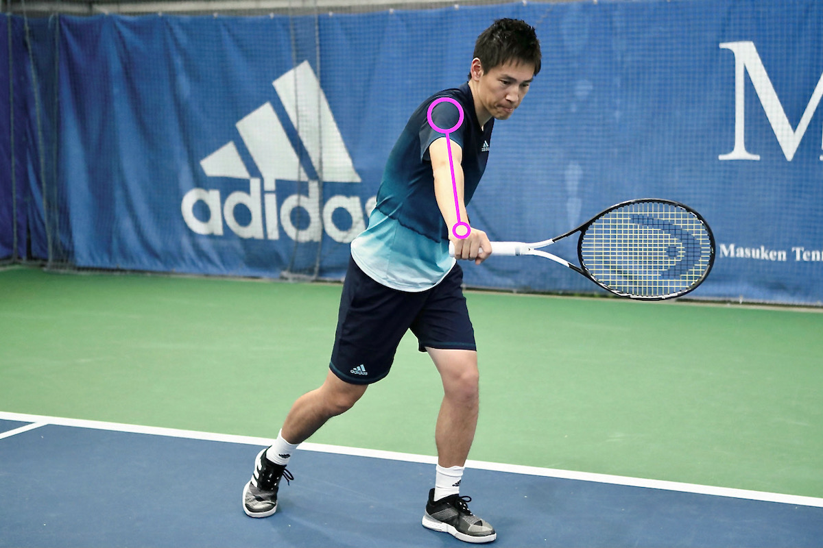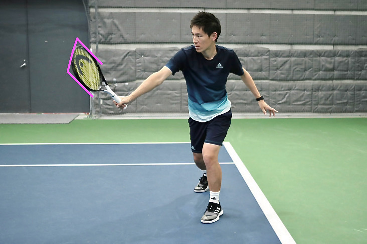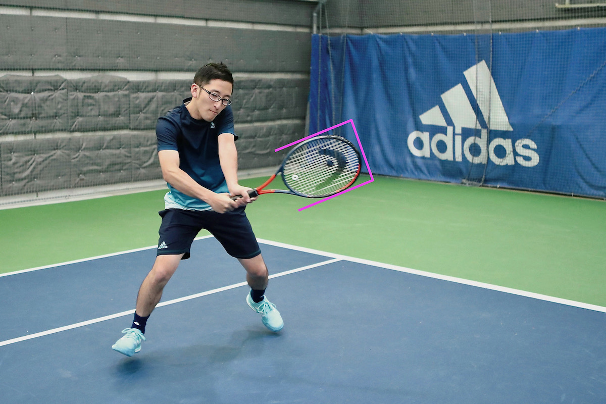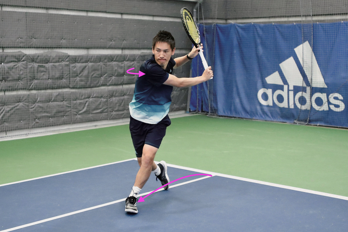 気をつけたいのは、スタンスを問わず『しっかり肩を入れる&体を開かずにスイングする』こと。特に片手バックでは、右肩を支点にスイングするので、開いて動いてしまうと余計に間に合わなくなります。