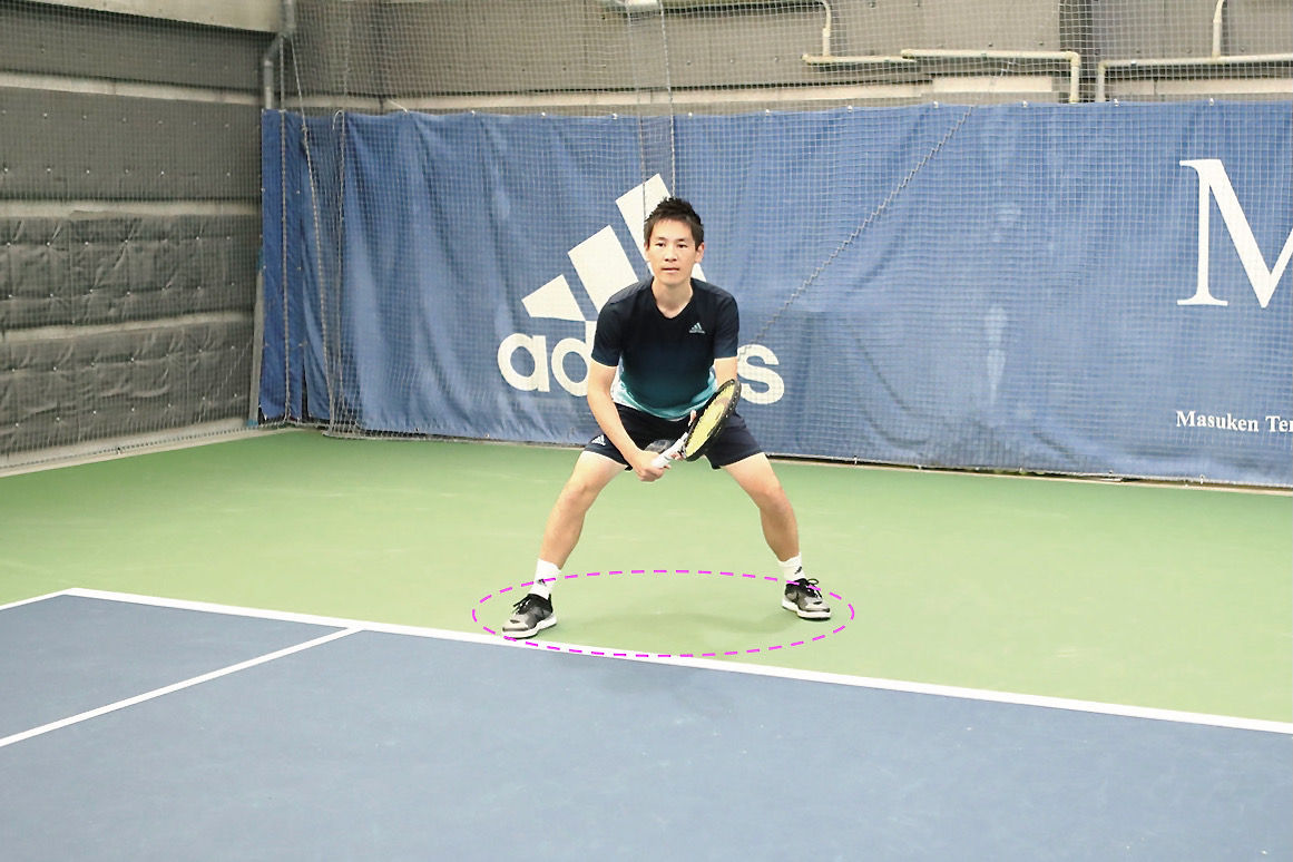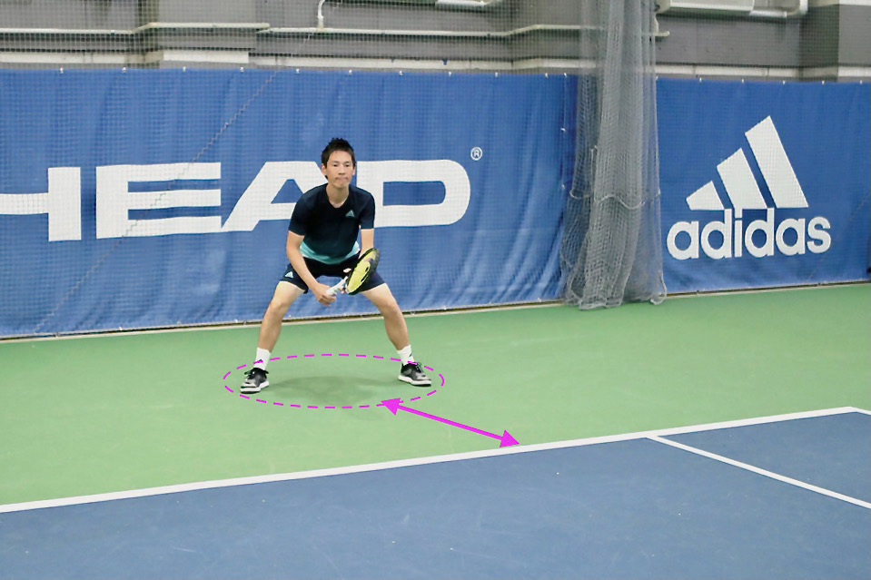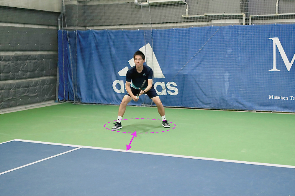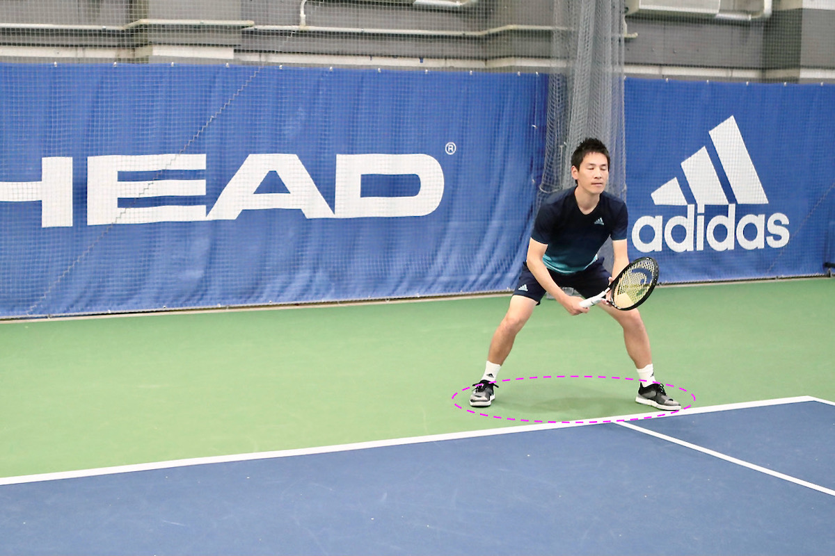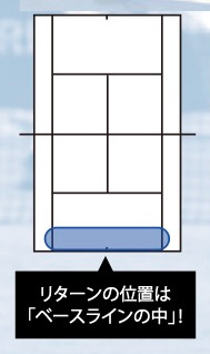 シングルスならばこの位置でOK。ダブルスの場合では、この位置では相手に時間を与えてしまい、曲がり幅も大きくなるのでオススメしない