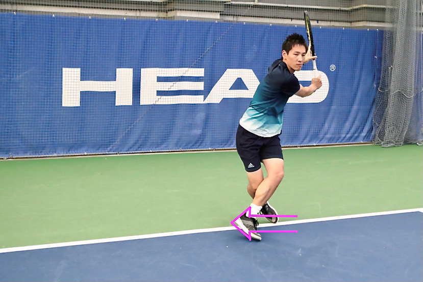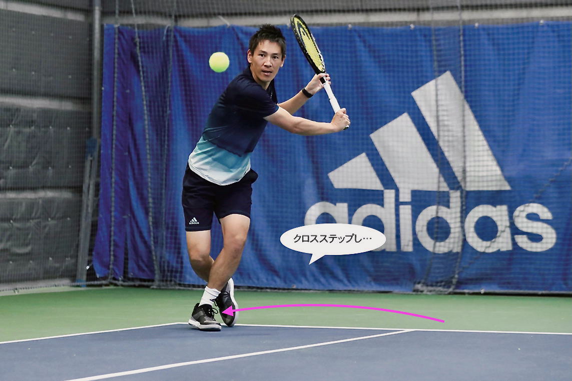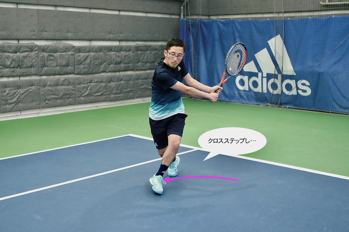 回り込みバックハンドのために大事なのがステップ。スプリットステップ後、『クロスステップで右斜め方向に動きだす』のです。そのステップと同時に「肩を入れる動作」(片手打ち・両手打ちともに)を忘れずに!