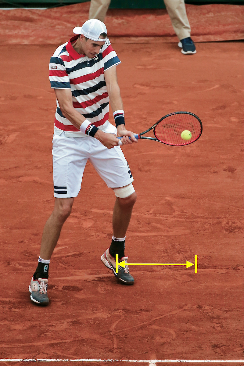 速やかなスイングのためには、(振るための)スペースが必要。そこで、「踏み込み足からラケット約1本分の距離が打点」と考えよう。踏み込み足は、スクエア・スタンスなら“右足”、オープン・スタンスなら“左足”となる。