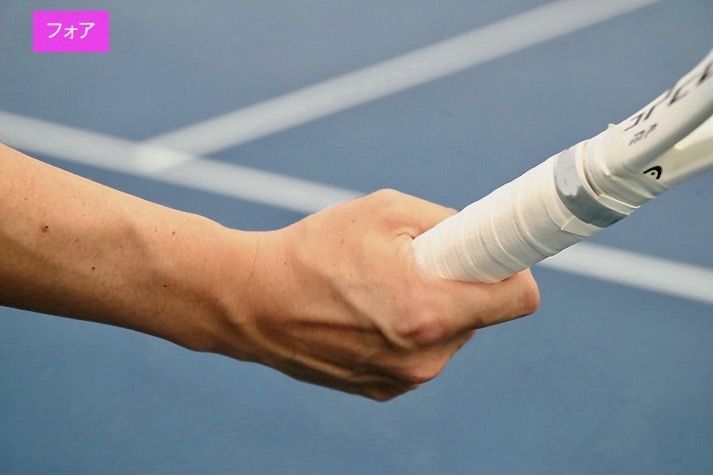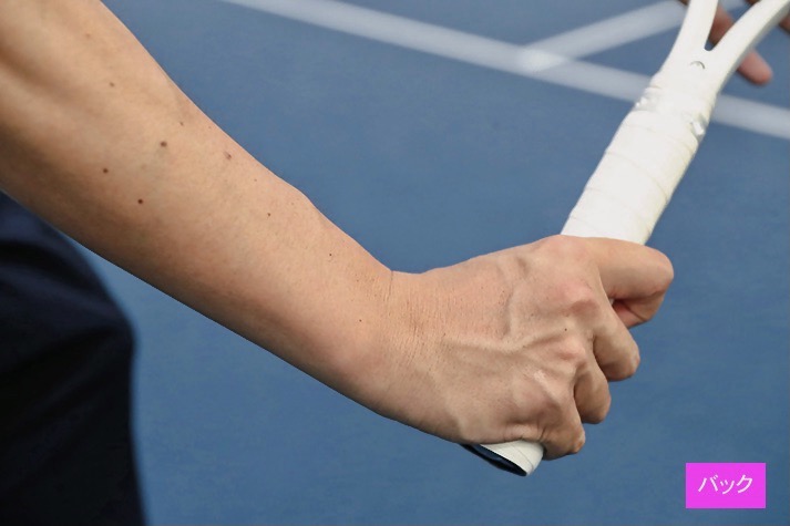 ボレーの握りでOK。好みにもよりますが、(1)手首の背屈(手首を甲側に曲げる)、(2)コック(手首を親指側に曲げる)すると強い打球でも球負けしづらくなります
