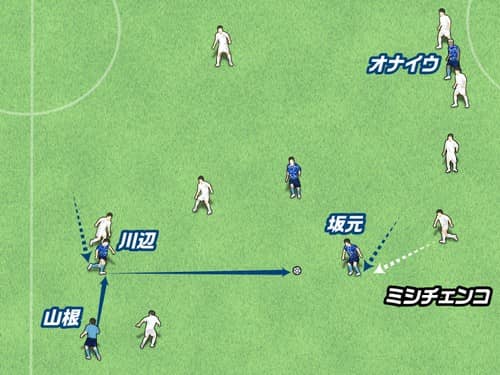 山根視来が右サイドでボールを持つと、ボランチの川辺駿がボールを受けに来た。山根が川辺の足元にパスをつけると、そのタイミングで前の坂元達裕が縦パスを受けに下がってきて、川辺はそこへワンタッチで鋭い縦パスを入れた。