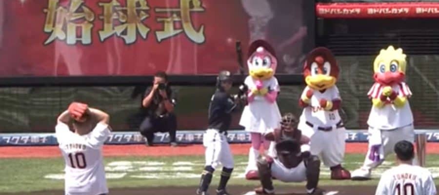【動画】猛抗議に球場も爆笑! サンドウィッチマンの伊達さんの“打たれる始球式”