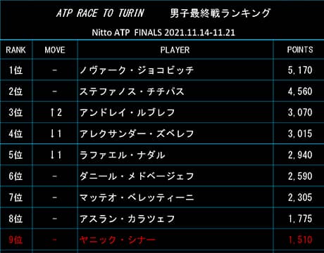 9位[ - ]:J・シナー(イタリア) 1,510ポイント