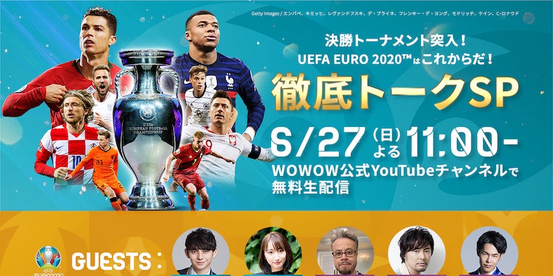 さらなる盛り上がりを見せるEURO 2020TM を一層楽しむために、6月27日(日)夜11:00よりWOWOWの公式YouTubeチャンネルでスペシャルプログラム「UEFA EURO 2020TM はこれからだ!決勝トーナメント突入!徹底トークSP」を生配信することが決定した。サッカーをこよなく愛するゲストを招き、これまでのグループステージの激闘を映像とともに振り返り、さらに決勝トーナメントへの展望を語り尽くす番組だ。