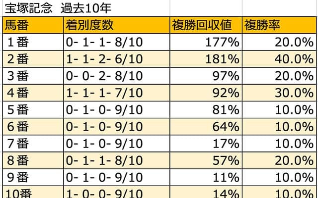 27日に阪神競馬場で行われる宝塚記念(3歳上・GI・芝2200m)について枠順・馬番別に検証していく。 過去10年、…