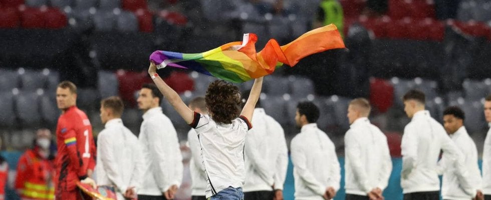 Oh wow! One spectator just ran on with a rainbow flag during the Hungarian national anthem. Loud cheers from the Germany block pic.twitter.com/EDJzdV0tbx