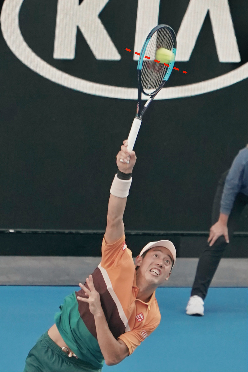 スイング速度が速い先で捕らえるほうが、威力はアップする (写真:錦織 圭[日清食品])