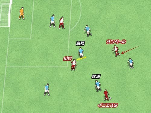 高橋が動いたあとのスペースにサンペールが入ると、山口はワンタッチでサンペールへボールを渡して、高橋と入れ替わるように裏へ抜け出した。そしてサンペールからのリターンを受けてワンツーを決め、抜け出しに成功。