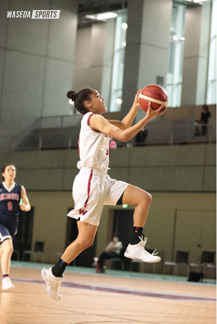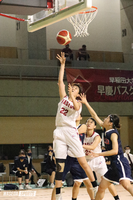 試合開始早々、パスミスから速攻を決められる。そこから流れは慶大へ傾いた。シュートをなかなか決められない焦りからパスミスを繰り返す早大に対し、F,C武藤怜(4年)のスリーポイントを中心に得点を重ねる慶大。ペースを立て直すことはできないものの、開始7分のGフェスターガードヤヤ(スポ2=宮崎・小林)のスリーポイントから点差を広げ、一時は10点差に。しかし、終了間際に慶大のG,F眞尾瞳(4年)にブザービートを決められ20ー15で第1Qを終えた。インターバル明け、ブザービートで勢いに乗りスリーポイントを多用してくる慶大。それに対し、高さで勝る早大はC松﨑玲那(社1=愛知・桜花学園)のポストプレーなど、インサイドを中心に攻める。ディフェンスでは相手の隙を突いたスティールが増え、ジリジリと点差をつけた。なかなか流れはつくれないものの、コンスタントに点を取り、52ー32で試合を折り返した。