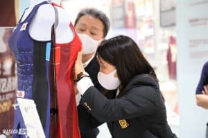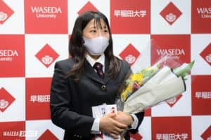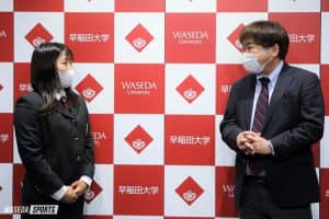 レスリング東京五輪アジア予選から約2カ月半。圧巻の優勝を飾り初の五輪代表に決まった須﨑優衣(スポ4=東京・安部学院)がこの日、家族と吉村祥子全日本女子コーチとともに早稲田スポーツミュージアムを訪れた。同席した石井昌幸競技スポーツセンター所長やレスリング部関係者からエールが送られ、須﨑は「今は楽しみなワクワクする気持ちでいっぱい。東京五輪では絶対に金メダルを獲得して今まで支えてくださった方々に最高の恩返しができるように頑張りたい」と力強く抱負を語った。