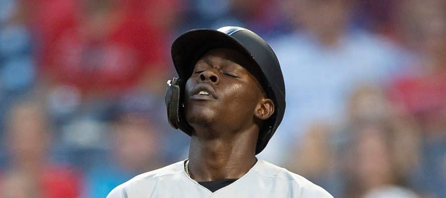 見逃し三振の判定に天を仰ぐマーリンズのジャズ・チザムJr.【写真:Getty Images】