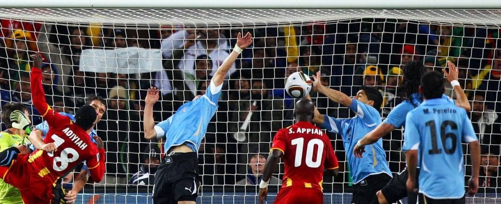 ガーナのFKの流れからゴール前で混戦になると、ガーナFWアサモア・ギャンがヘディングで押し込む。GKフェルナンド・ムスレラは前に出ており、決まったかと思われたが、ウルグアイのFW ルイス・スアレスが手を使ってシュートをストップ。スアレスは一発退場となり、ガーナがPKを獲得した。
