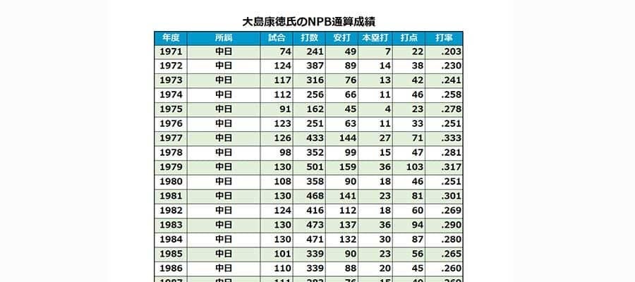 大島氏は大分・中津市の出身。中津工から1968年のドラフト3位で中日に入団すると、1983年には36本塁打で本塁打王に輝いた。1988年には日本ハムに移籍し、44歳まで現役としてプレーし、26年間で2204安打、382本塁打の成績を残した。