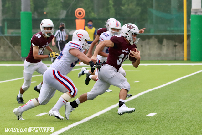 早大はポジションを大幅に入れ替え、ディフェンスからスタートの第3Q。ロスタックルが反則になり、1stダウン更新を許し、以降押され気味の展開が続いたが、4thダウン残り2ヤードを守り通す。直後の攻撃ではWR/DB坂井瑞生(政経1=東京・早大学院)へのロングパスが決まった。その後次々に1stダウンを更新するも、得点にはつながらず。第4Qに突入し中大から攻撃が始まったが、相手のファンブルを誘ってリカバーし攻守交替。その後は両校4thダウンのギャンブルに失敗し拮抗した状態が続く。中大オフェンスで早大の反則があり1stダウンを更新したところで試合時間残り2分を切った。ラスト2分は中大のスピード感あるオフェンスに押され、ゴール前10ヤード付近まで押し込まれる展開に。しかし、第4Q残り35秒、4thダウンギャンブルのパスをWR/DB藤崎竜馬(国教1=東京・早大学院)がインターセプトし攻守交替。得点6-0、早稲田のオフェンスで試合を終えた。