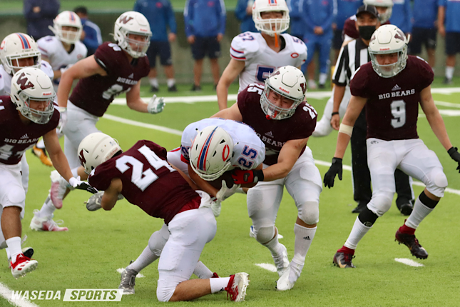 第1Qは早大のオフェンスから始まった。序盤は3rdダウンのパスが通らず攻撃権を譲ることに。新人戦では、特別ルールとしてキックが行われないため、敵陣35ヤードから中央の攻撃となり、立て続けに1stダウンを更新され、すかさず早大はタイムアウトを取った。続くプレーではOL/DL熊野雄斗(政経1=東京・麻布)のファンブルリカバーにより攻撃権を獲得。しかし両校攻撃が決まらない展開が続く。FB/DL堤祥悟(教育1=東京・早実)、 WR/DB藤澤好輔(政経1=東京・早大学院)など、随所でディフェンスのタックルが光るも、得点は無いまま第1Qが終了した。第2Qは中央オフェンスで再開したが、WR/DB木村大地(法1=東京・早大学院)のインターセプトによりすぐさま攻撃権を獲得。そこで波に乗って早大はRB/DB味岡海斗(法1=東京・早実)のロングゲインでゴール前残りわずか1ヤード地点まで攻め込む。そして次のプレーでRB/DB松澤学(スポ1=東京・早実)がTDを決めた。その後は再び中央に立て続けに1stダウンを取られるも、4thダウンショートを守りきり6-0で前半を終えた。