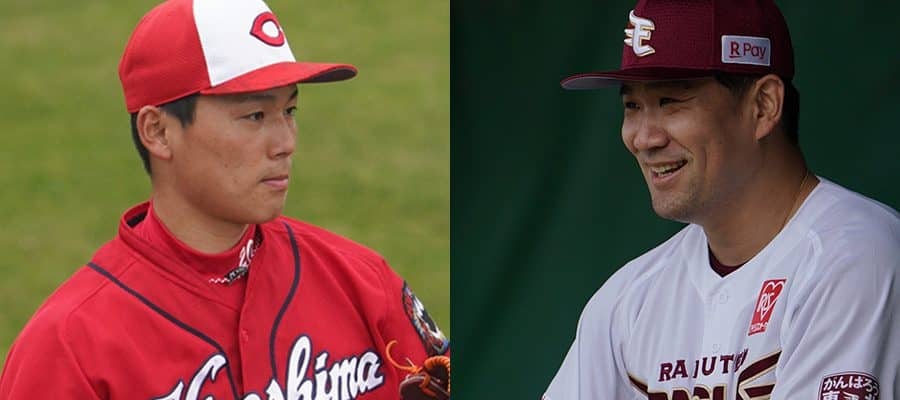 広島・栗林良吏(左)と楽天・田中将大【写真:荒川祐史】