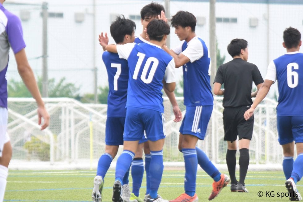 <写真・山見の得点後、駆け寄る選手たち> 7月6日、J-GREEN堺・S9フィールドにて第50回関西学生サッカー選手権大…