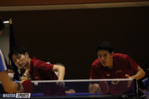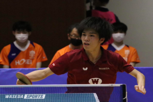 1回戦で対戦したのは、関東学生リーグで2部に所属する大正大。早大は1番手に五十嵐史弥主将(スポ4=石川・遊学館)を立てる。五十嵐はいきなり第1ゲームを落としたが、持ち前の強気の卓球を貫いた。第2ゲーム以降は立て直し、ゲームスコア3―2で勝利。五十嵐が作った勢いのままに、2ゲーム目、柏竹琉(スポ2=東京・エリートアカデミー/帝京)、3ゲーム目五十嵐・川上直也(スポ4=静岡学園)組も勝利。団体戦スコア3−0で、決勝トーナメント初戦を快勝で飾った。