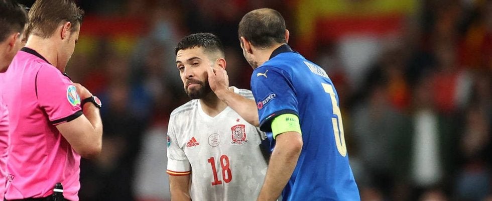 PK戦のエンドを決めるべく、コイントスのために審判団の元へイタリアDFジョルジョ・キエッリーニとスペインDFジョルディ・アルバの両キャプテンが集まった。