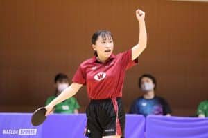 決勝の相手は関西学生リーグ1部所属の神戸松蔭女学大。「足元をすくわれないように一戦一戦、一からの気持ちで」(岩越)。専大との準決勝から間もなく、大学日本一をかけた東西対決が始まった。1番手の笹尾は「勝ちたいという気持ちが強くなりすぎて」とプレーに力が入り最初の2ゲームを落としたが「3ゲーム目からは力を抜いて落ち着いてプレーしようと思ったことが良かった」(笹尾)。本来のプレーを取り戻すと、決定力のあるフォアハンドで流れを手繰り寄せた。11-3、11-5、11-5と大差で3ゲームを連取し、逆転勝ちを決めた。