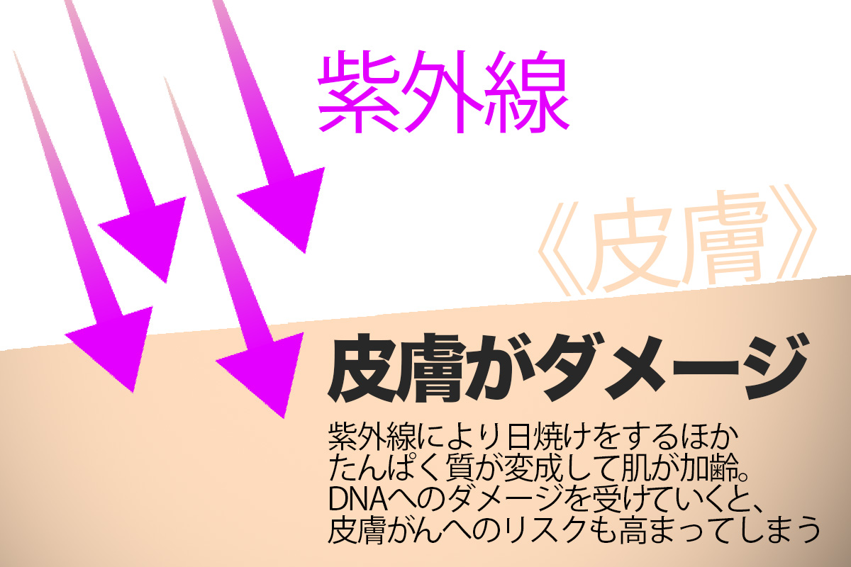 紫外線というと、日焼けというイメージがある。もちろん、それも一つだが、紫外線は、たんぱく質を変性させるため、皮膚がダメージを受けてしまう。具体的には肌の加齢である。そしてDNAへのダメージを受けていくことで、皮膚がんへのリスクも高まってしまうのだ。さらに皮膚だけでなく、目に紫外線が届き、ダメージが蓄積していくと最悪白内障にもなってしまうという。共に最悪のケースではあるが、我々は紫外線から体を守ることが大事なのだ。