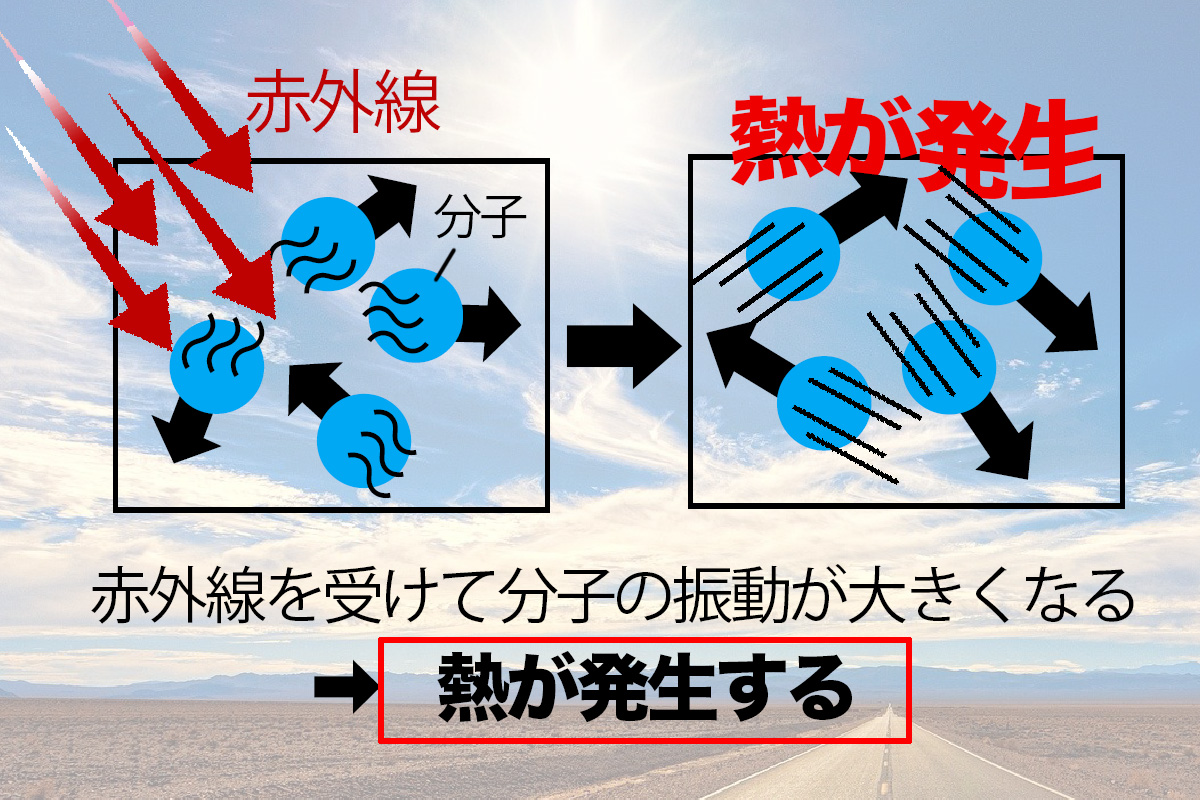 赤外線には分子を高速に振動させて発熱させるという効果がある。太陽光を浴びた地面や建物も、分子が振動して暑くなる。それは人体もしかり。夏場に太陽光を浴びて、ジリジリと暑く感じるのは、人体の分子が反応して振動しているという証しなのである。