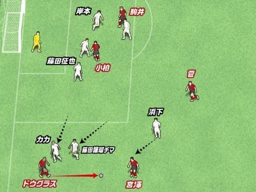 宮澤がドウグラスにパスを送り、ボールをもらったドウグラスはそのまま左サイド敵陣深くに進入していく。これに徳島CBのカカが釣り出され、ボランチの藤田譲瑠チマも囲みにいった。宮澤のパスで裏を取られた徳島SBの藤田征也は、帰陣してカカの空けたスペースのカバーに入っていた。