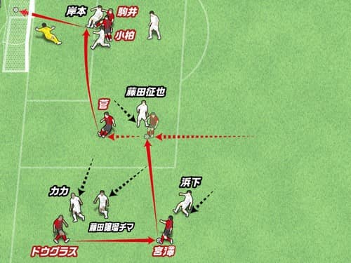 そこを逃さなかったのが菅である。菅はその空いたスペースに走り込むと、宮澤は右アウトサイドの巧みなワンタッチパスを送る。菅の進入に気づいた藤田征也が慌てて寄せに行くが、菅はファーストコントロールで縦へ抜け出し、すぐに左足のクロスを入れた。