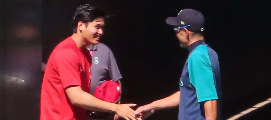 試合前に談笑するエンゼルス・大谷翔平(左)とマリナーズ・イチロー氏【写真:木崎英夫】