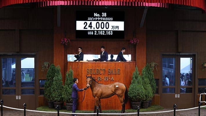 12日、苫小牧・ノーザンホースパークで行われている日本最大のサラブレッド市場「セレクトセール2021」1歳馬セールにて、上場番号38番・エピックラヴの2020(牡)が2億4000万円で落札された。