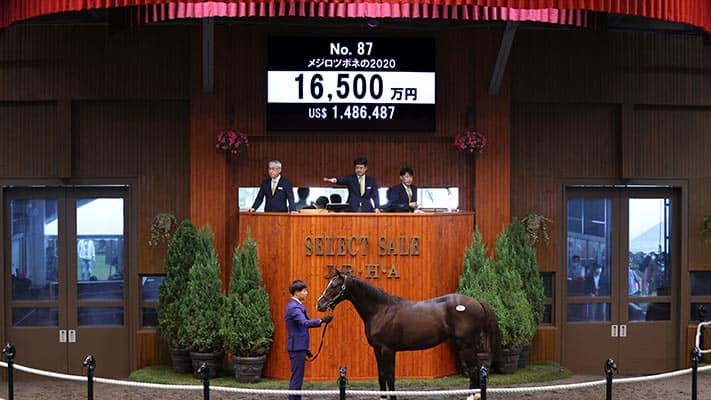 12日、苫小牧・ノーザンホースパークで行われている日本最大のサラブレッド市場「セレクトセール2021」1歳馬セールにて、上場番号87番・メジロツボネの2020(牡)が1億6500万円で落札された。