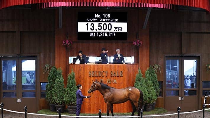 12日、苫小牧・ノーザンホースパークで行われている日本最大のサラブレッド市場「セレクトセール2021」1歳馬セールにて、上場番号108番・シルヴァースカヤの2020(牡)が1億3500万円で落札された。